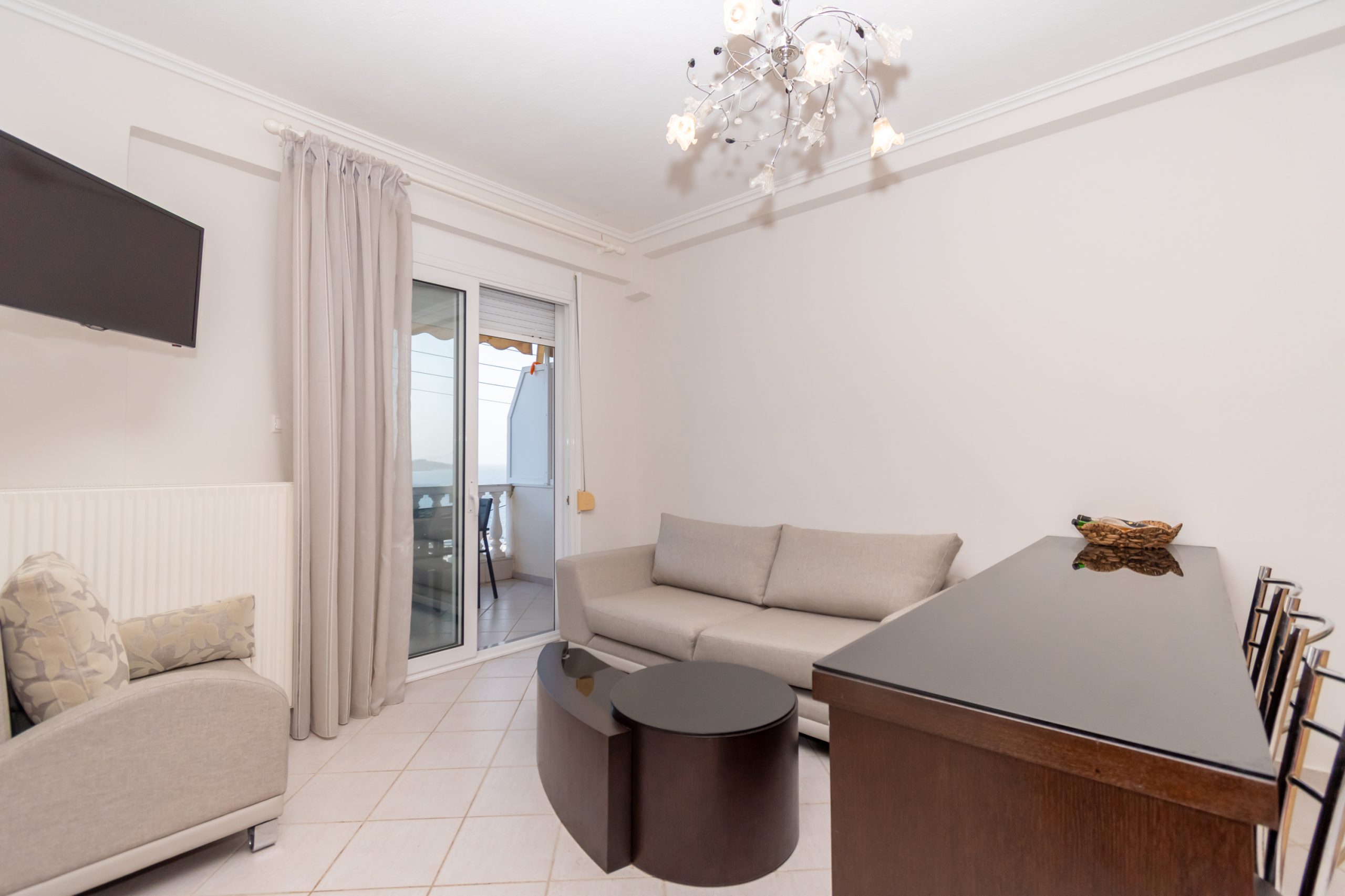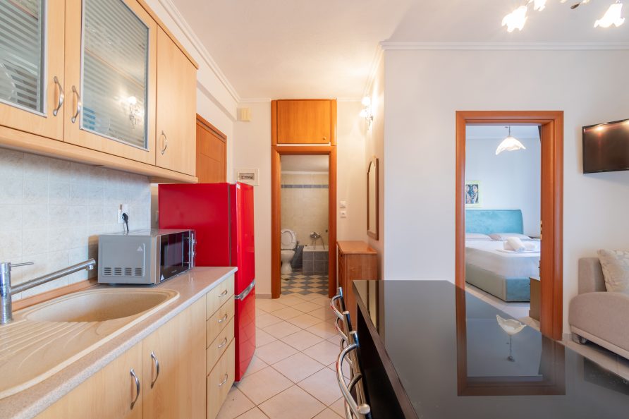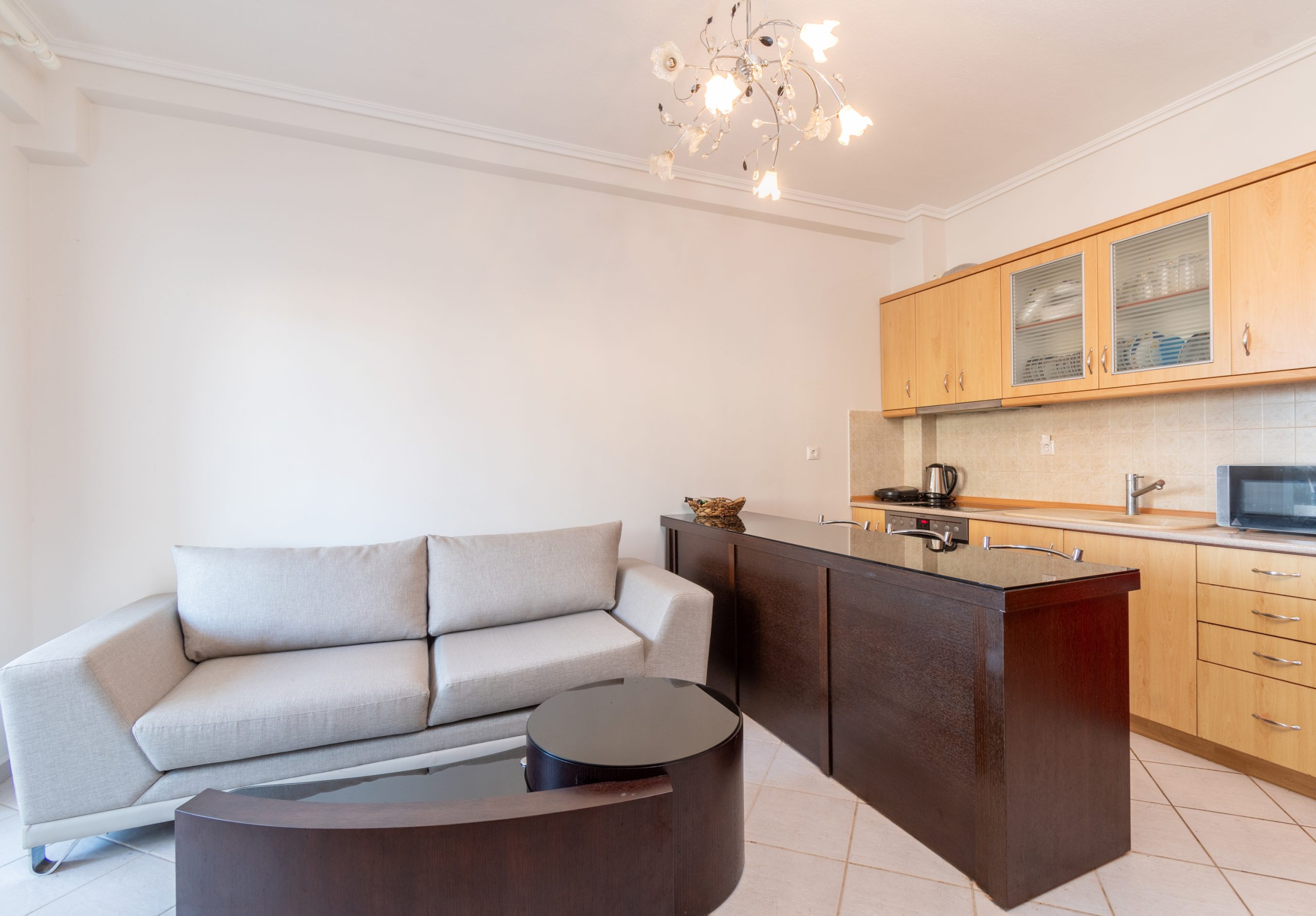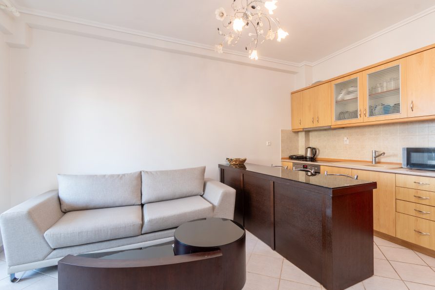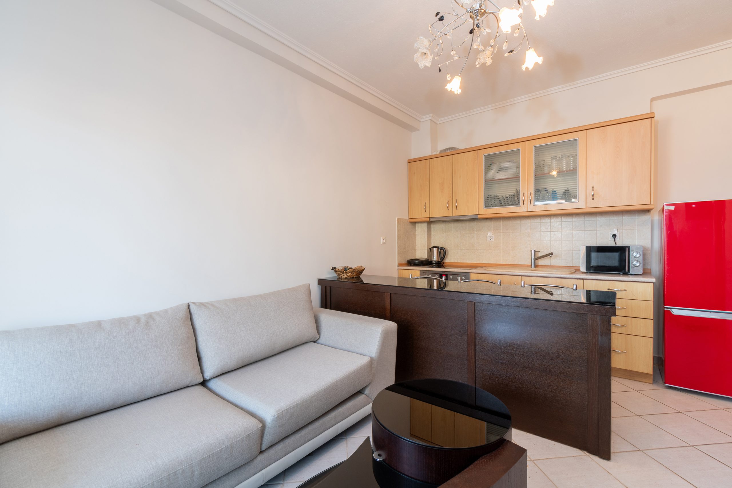 The room size is 40 sqm. It is equipped with a small kitchen, TV, air-conditioning unit, two comfortable chairs, huge wardrobe and bathroom.